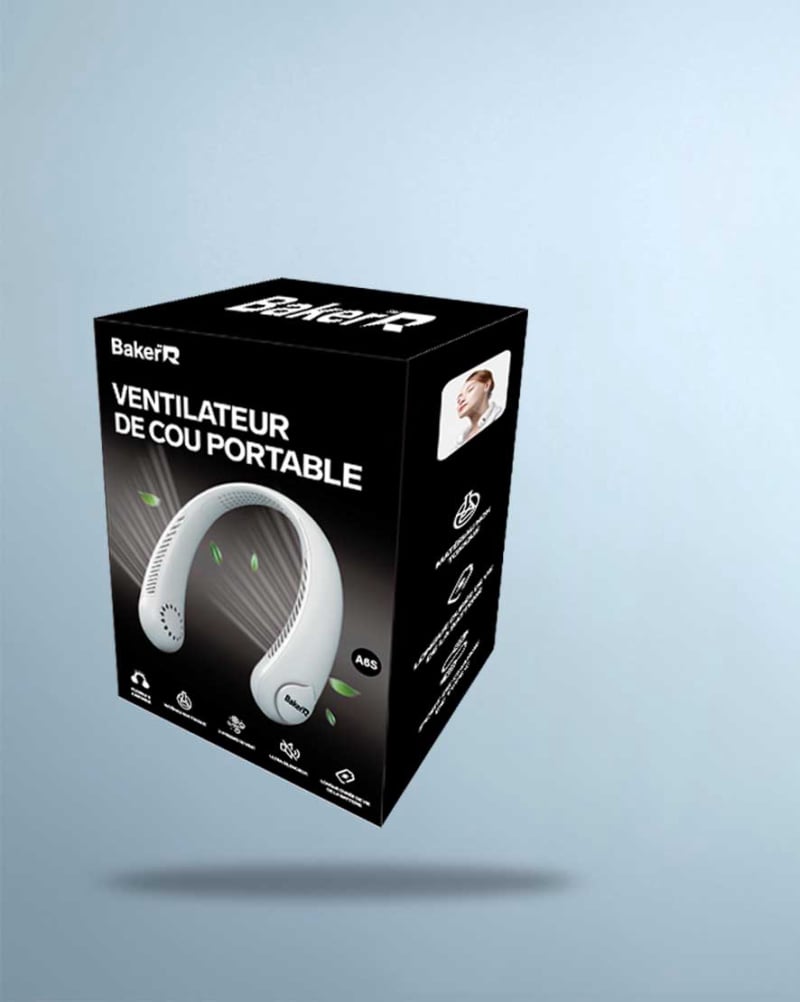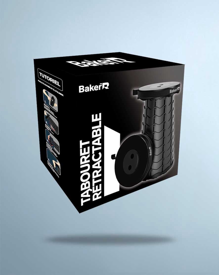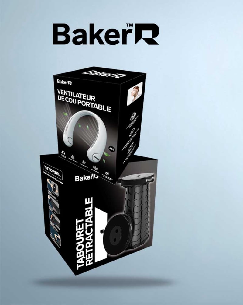 Création des packagings pour les tabourets rétractables ainsi que pour le ventilateur de cou commercialisés par l'entreprise Bakerr à Tahiti.